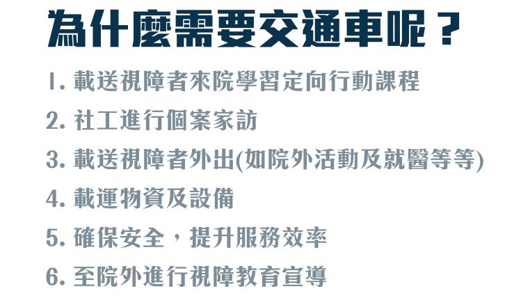 希望大家能夠協助我們,幫助我們將機構的交通車汰舊換新,這不只是一台車,而是一條通往希望的道路,是連結你我與視障者的起點,邀請您加入「載愛前行,重建希望」的行列,讓每一段人生旅程,不再孤單!