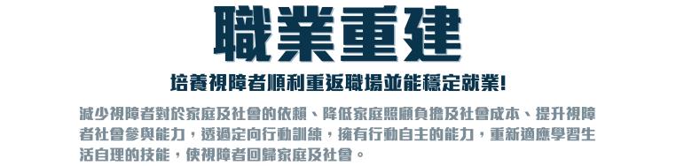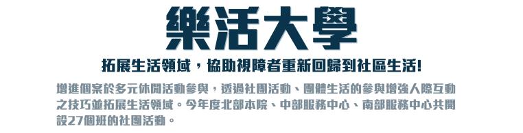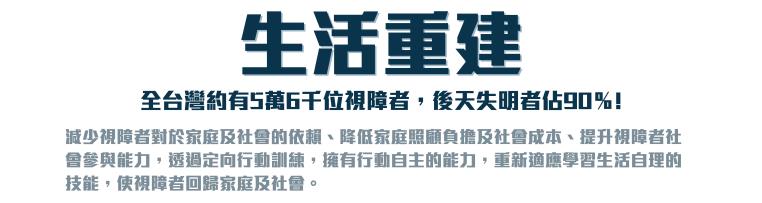 立案核準文號:臺省社字第007號 協助視障者走出黑暗照常生活,避免其自暴自棄,導致家庭破碎或走上絕路,致力於發展「生活重建」、「職業重建」、「視障社區大學」及「社區關懷活動」等.....