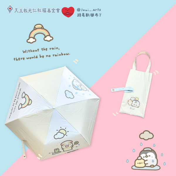 從事插畫創作已有四年的路易斯,是著名的人氣插畫家。筆下「天竺鼠布丁」、「迷因貓貓」、「企鵝皮蛋」與「地瓜球小雞」憑藉可愛療癒的風格廣受歡迎。這次,為光仁設計的雨傘,巧妙描繪從雨天、陽光到最後彩虹高掛的意象,象徵身障者在人生旅程中面對的挑戰與困難,最終將迎來屬於自己的彩虹。邀請您,一同看見他們閃耀的光芒,並成為溫柔守候的力量。