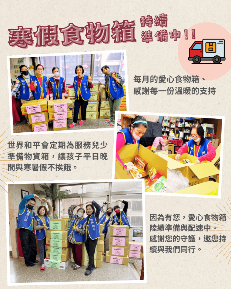 世界和平會愛心食物站,定期為服務家庭添購生活食品,讓孩子在平日晚間或是沒有上學的日子,可以簡單料理食用、不挨餓。我們也誠摯地邀請您,一起伸出援手、為孩子們添上一份穩定與安心的力量。「袋」受飢兒過好年:https://lecoin.cc/donation/4545
